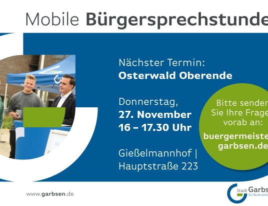 Spontanes Vorbeikommen bei mobiler Bürgersprechstunde möglich GARBSEN (stp). Bürgermeister Claudio Provenzano ist im Rahmen seiner mobilen Bürgersprechstunde in Osterwald anzutreffen. Termin ist Donnerstag, 27. November, 16 bis 17.30 Uhr. Treffpunkt ist am Gießelmannhof an der Hauptstraße 223. Wie immer ist es möglich, spontan vorbeizukommen und das Gespräch zu suchen. Um adäquat antworten zu können, bittet der Bürgermeister, Fragen zu komplexeren Sachverhalten vorab einzusenden – per E-Mail an buergermeister@garbsen.de oder per…