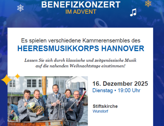 Unter dem Motto „Freude schenken – gemeinsam Gutes tun“ lädt der Rotary-Club Garbsen-Wunstorf am Dienstag, den 16. Dezember 2025, um 19:00 Uhr, zu einem festlichen Benefizkonzert in der Stiftskirche Wunstorf ein. Musikalisch gestaltet wird der Abend von verschiedenen Kammerensembles des Heeresmusik-korps Hannover. Mit einer abwechslungsreichen Mischung aus klassischer und moderner Musik stimmen sie auf die bevorstehenden Weihnachtstage ein. Die Stiftskirche bietet dabei den stim-mungsvollen Rahmen für ein Konzert, das musikalische…