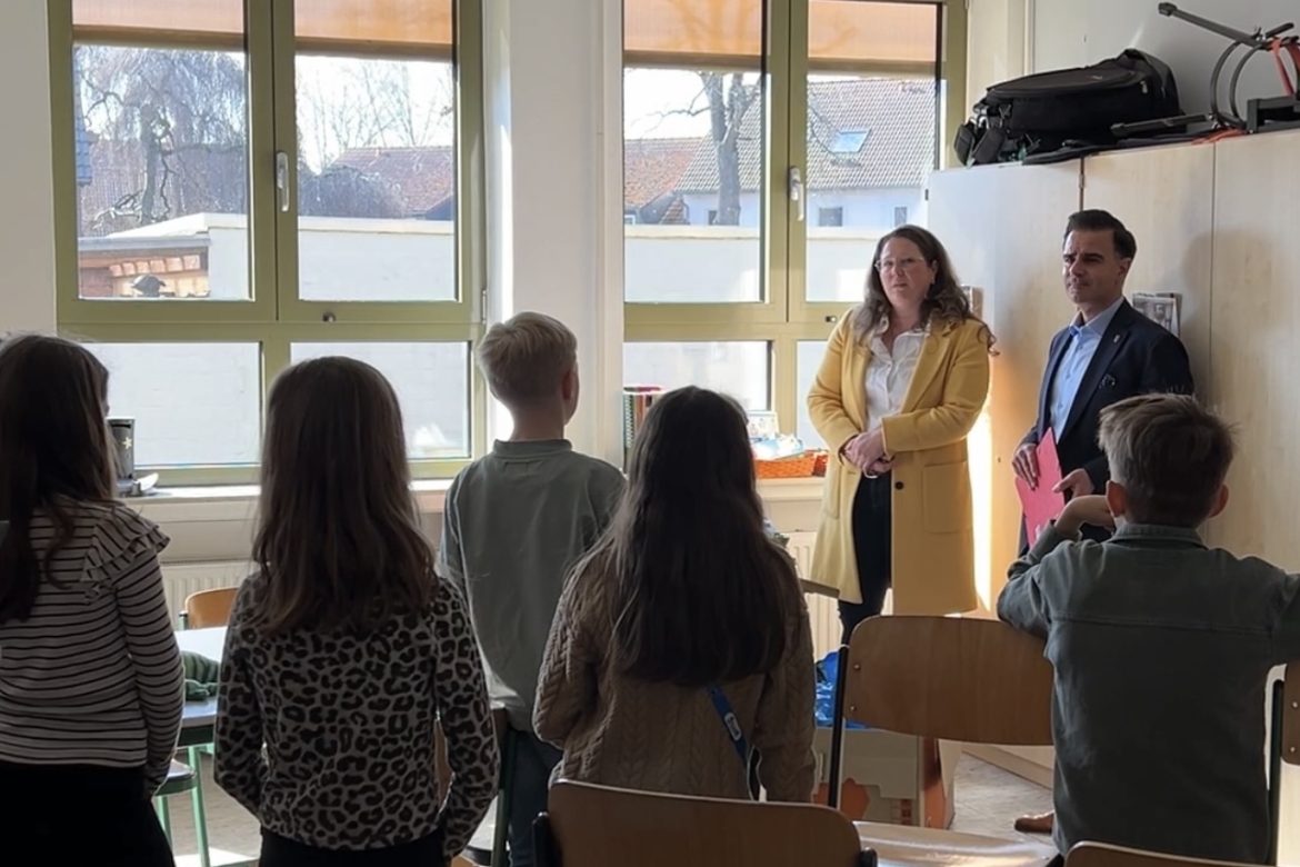 GARBSEN (stp). Im Rahmen des Formats „Bürgermeister@School“ hat Bürgermeister Claudio Provenzano die Grundschule Frielingen besucht. Der Schülerrat bedankte sich für das neue Holzhaus auf dem Schulhof präsentierte Ideen für mehr Nachhaltigkeit und für die Ausgestaltung der Schulräume.