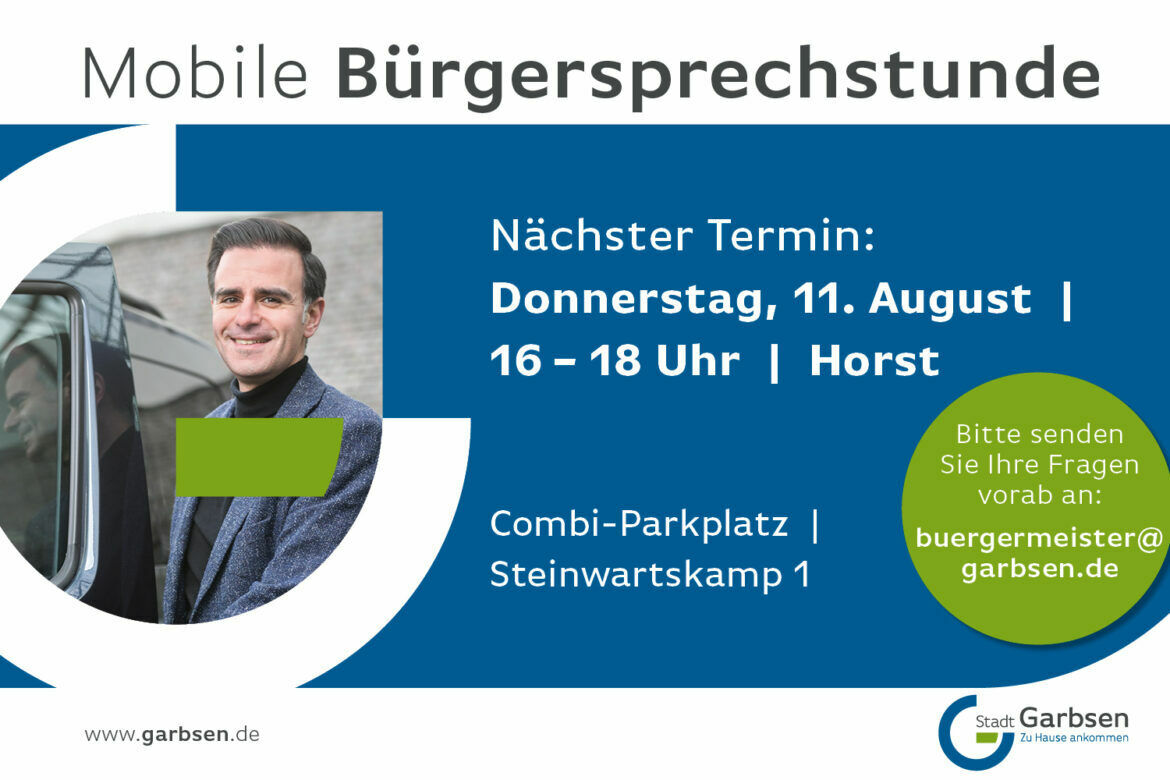 Wie immer ist es möglich, spontan vorbeizukommen und das Gespräch zu suchen. Um adäquat antworten zu können, bittet der Bürgermeister, Fragen zu komplexeren Sachverhalten vorab einzusenden – per E-Mail an buergermeister@garbsen.de oder per Post an: Bürgermeister Claudio Provenzano, Stadt Garbsen, Rathausplatz 1, 30823 Garbsen.