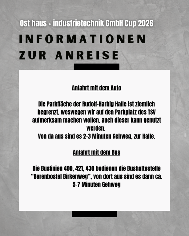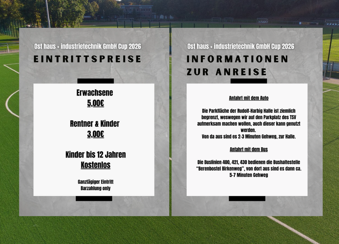 Aktuelles Sport TSV Berenbostel VereineEintrittspreise & Anfahrtsinfos für den Ost haus+industrietechnik GmbH Cup 2026 Wichtige Infos zur Anfahrt sowie die Eintrittspreise, für den morgigen Budenzauber.