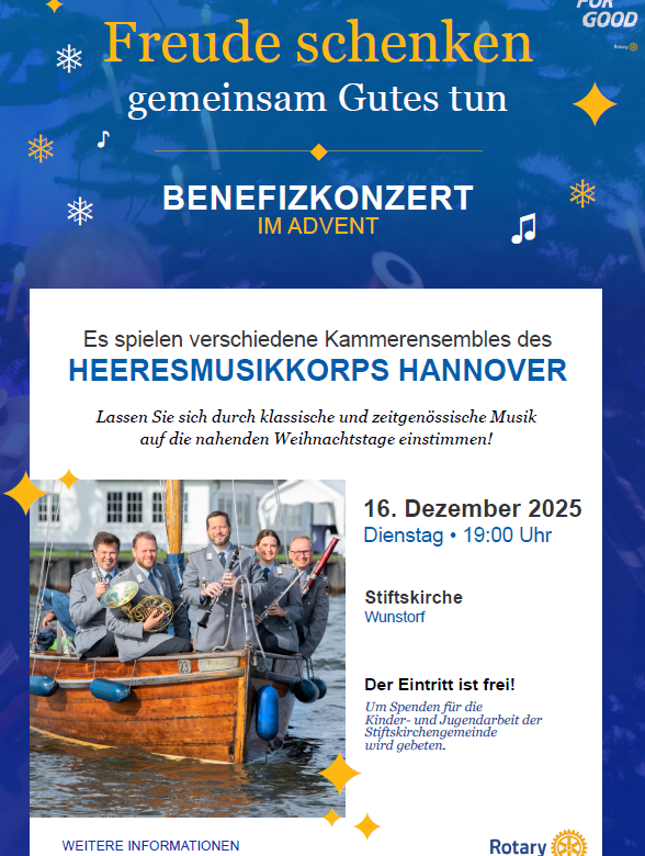 Unter dem Motto „Freude schenken – gemeinsam Gutes tun“ lädt der Rotary-Club Garbsen-Wunstorf am Dienstag, den 16. Dezember 2025, um 19:00 Uhr, zu einem festlichen Benefizkonzert in der Stiftskirche Wunstorf ein.