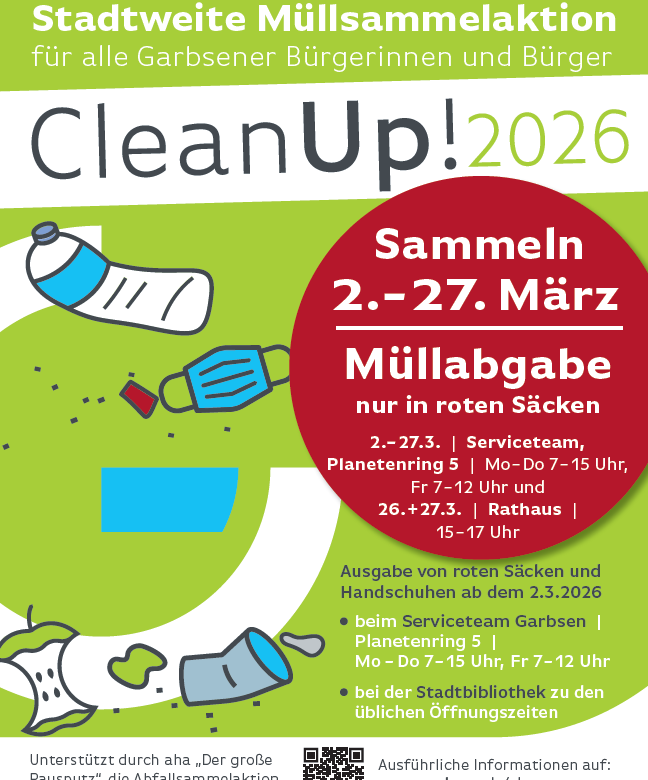 „Machen Sie mit und setzen Sie gemeinsam mit uns ein starkes Zeichen für eine saubere und lebenswerte Stadt“, sagt Provenzano. Jeder eingesammelte Müllsack zählt – für unsere Natur, unsere Tiere und für kommende Generationen. Bei Fragen zur Aktion steht die Umweltbeauftragte Fabienne Beck zur Verfügung – erreichbar unter Telefon (0 51 31) 70 74 79 oder mittels E-Mail an klimaundumwelt@garbsen.de.