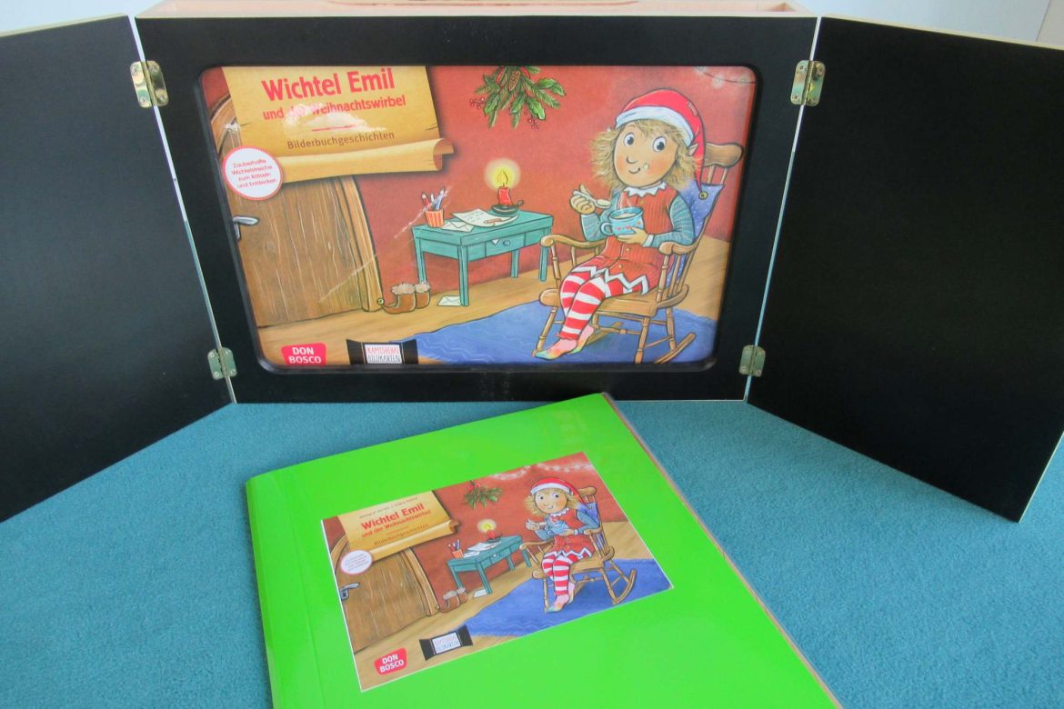 Der Kamishibai-Holzrahmen öffnet sich für dreijährige Kinder am Freitag, 12. Dezember, um 15 Uhr für die Geschichte „Wichtel Emil und der Weihnachtswirbel“. Darum geht es: In der Adventszeit stellt ein Weihnachtswichtel einen Haushalt auf den Kopf. Wichtel Emil hat es eilig, Anfang Dezember zu Familie Klein zu kommen. Seine Sachen gepackt, macht er sich auf den Weg. Auf seiner Reise hinterlässt er Spuren im Winterwald – genauso wie schließlich im Haus der Familie. Bei jedem Streich ist Wichtel Emil einen Schritt voraus und taucht erst am Ende persönlich auf. Was hat er angestellt? Das gilt es, herauszufinden.