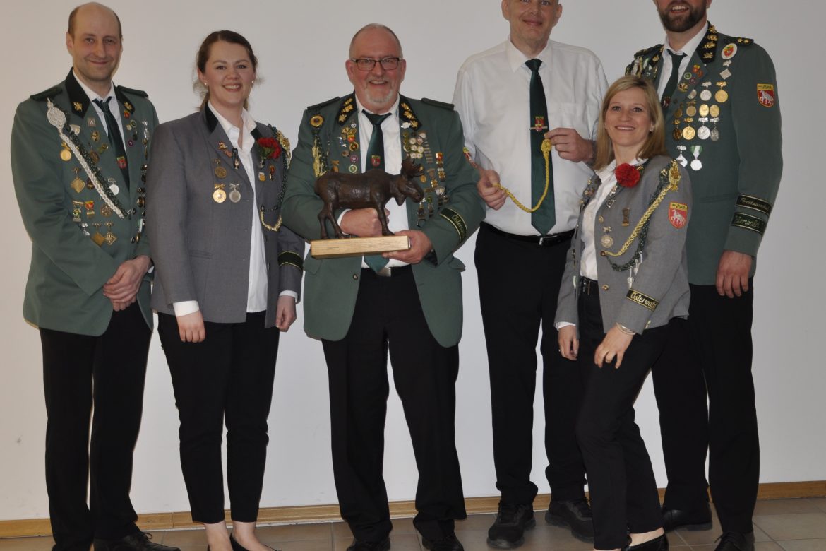 Dann riefen Lea Bollhorst und Frank Weiß zur Siegerehrung. Frank Weiß las für das Elchschießen im Schnelldurchgang alle Platzierungen bis Platz 5 vor. Platz 4 und somit Bronze gab es für Renee Struss (36,2), auf Platz 3 (Silber) kam Fabian Feise (33,1), Platz 2 (Gold) für Ariane Arand (33,8). 2025 gab es für ihn noch den Holzorden, diesmal durfte er den Elch mitnehmen: Sieger Jürgen Runkehl (34,0). Den Holzorden (Mal der Schande) erhielt diesmal wegen unkorrekter Uniform Conny Kothe.