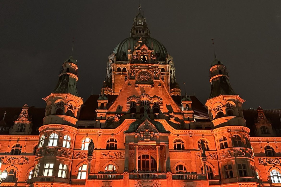 endete am Platz der Menschenrechte vor dem Neuen Rathaus, welches in Orange beleuchtet war.