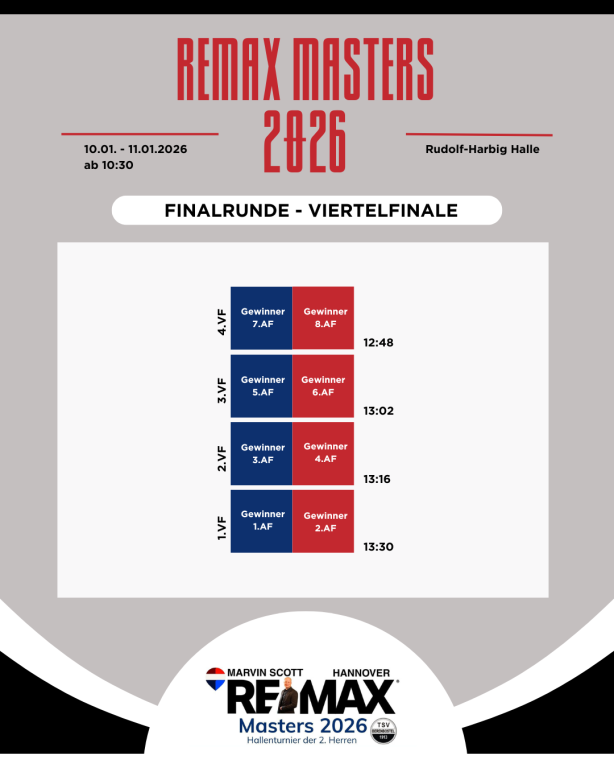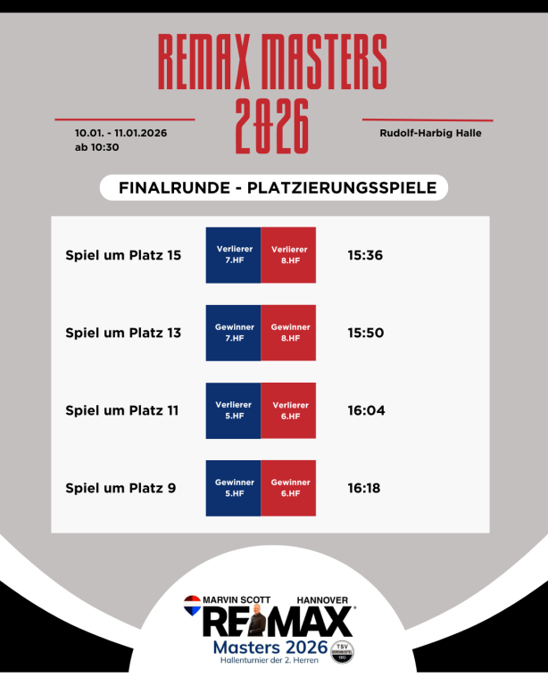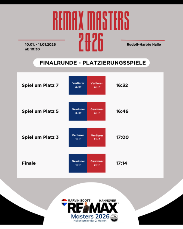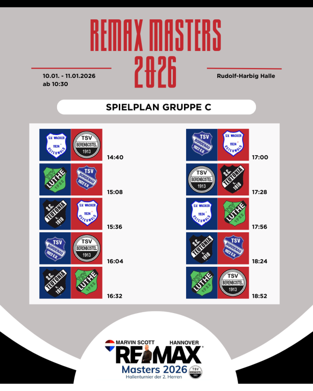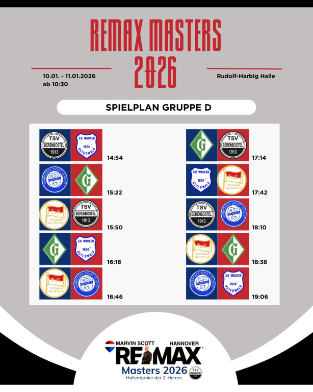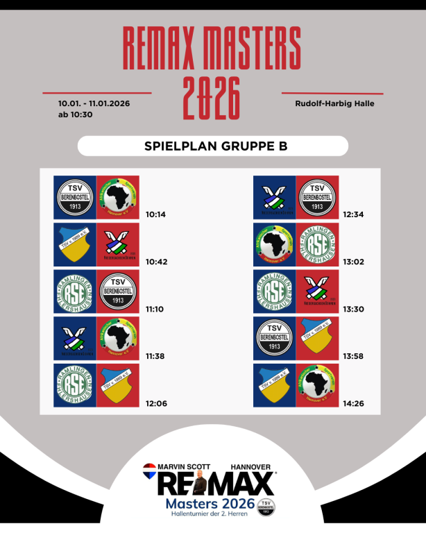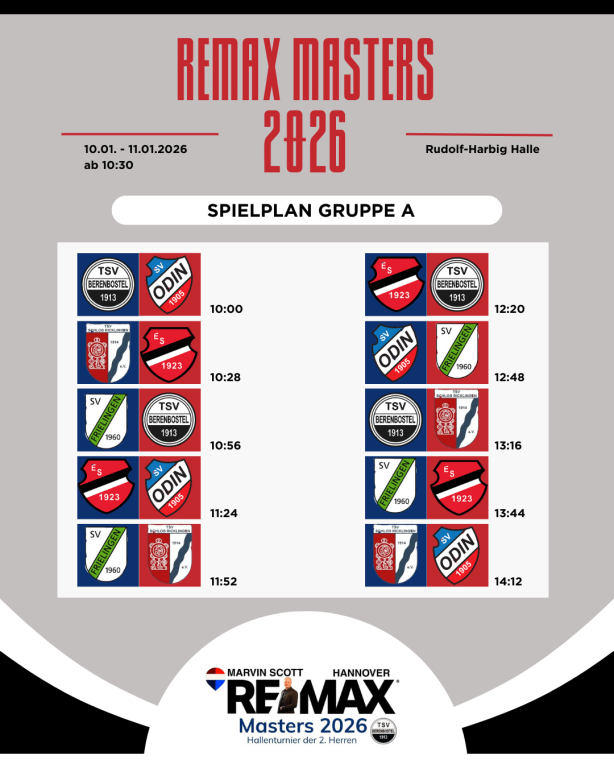 Aktuelles Sport TSV Berenbostel VereineREMAX Masters 2026 – Der Spielplan steht! Der große Spielplan für ein noch größeres Turnier am Samstag und Sonntag steht!
