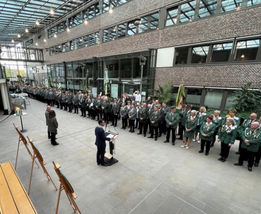 GARBSEN (stp). Mit einem festlichen Aufmarsch haben rund 200 Schützinnen und Schützen der Garbsener Vereine am Dienstagabend in der Rathaushalle ihre Majestäten geehrt. Begleitet vom Spielmannszug aus Schloß Ricklingen zogen die Vereinsmitglieder in die geschmückte Halle ein und setzten damit den feierlichen Auftakt zum traditionellen Scheibenannageln. Bürgermeister Claudio Provenzano begrüßte die Gäste und hob die besondere Bedeutung des Stadtschützenfestes und des Scheibenannagelns hervor: „Mit den Schützenscheiben tragen wir die Namen der Majestäten in unser Rathaus hinein und setzen damit ein sichtbares Zeichen für das lebendige Vereinswesen in Garbsen. Ich freue mich, dass wir heute wieder so zahlreich zusammengekommen sind, um die Leistungen unserer Schützinnen und Schützen zu würdigen.“